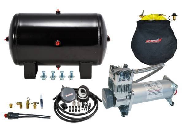 5.0 gallon air tank with seven ports (2 x 1/2" NPT and 5 x 1/4"), all steel construction, manufactured to SAE J10 and FMVSS 121 standards. Made in the USA.; All necessary fittings and mounting hardware included; "Snorkel" air intake relocation kit included; 150 PSI 100% duty PSI sealed compressor; 110/145 PSI pressure switch included