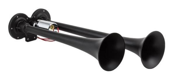 Dual black truck horn, two all metal trumpets 16.75" and 14.5" in length with XCR2.0 corrosion resistant coating. Think fire truck or ambulance air horn but LOUDER! Our compact air horns can fit in almost any vehicle and deliver the big sound you need.