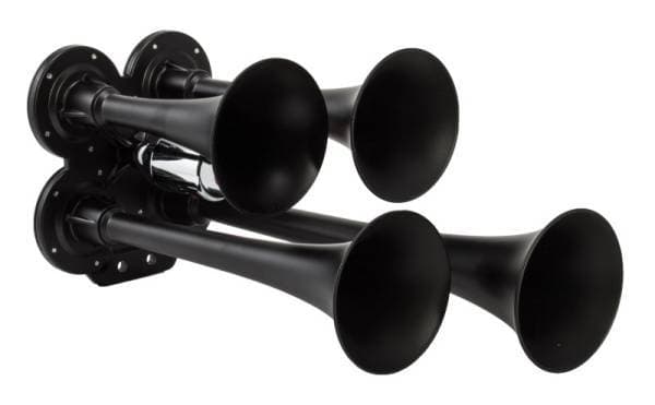Vortex 4 12-volt electronic air horn solenoid included; All metal body with chrome plated zinc alloy trumpets; Four trumpets, 13", 11", 8 1/2" and 7" in length; Loud, full, clean sound; Up to 153.1 db output