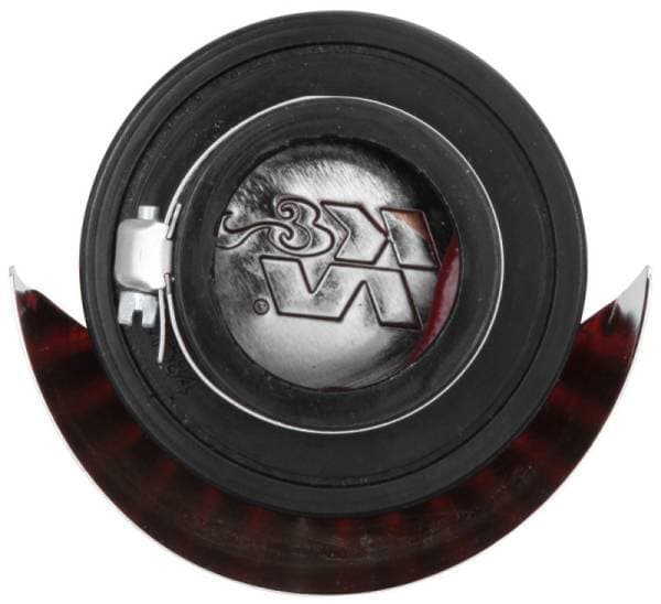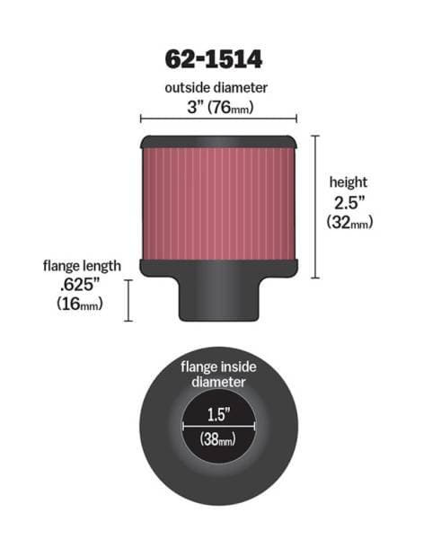 This non-woven synthetic crankcase vent filter comes with a K&N embossed chrome top, rubber base and chrome deflector shield. The flange is 1-1/2 inch inside diameter and clamps directly on to metal or plastic tubing.; C/V 1-1/2in.FL 3in.OD 2-1/2H W-D/S