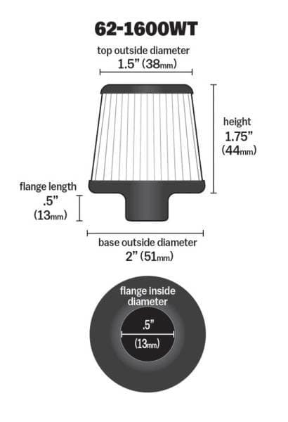 Constructed with a white synthetic filter media, this cone-shaped crankcase vent filter comes with a K&N embossed chrome top and steel base. The flange clamps onto a 3/8 to 1/2 inch metal or plastic tubing.; 3/8in.-1/2in.ID FLG X 2in.OD B X 1-3/4in.H X 1.5in.TP CR