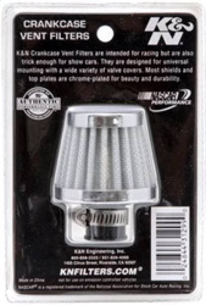 K&N crankcase vent filters are perfect for racing applications, vintage cars or individuals who want to add some aesthetics to their classic carbureted engine. The cone-shaped 62-1600WT crankcase vent filter has a K&N embossed chrome top and chrome base. The flange clamps directly onto a 3/8 to 1/2 inch metal or plastic tubing where venting is needed. Constructed with a white colored synthetic media it can be cleaned and reused repeatedly.