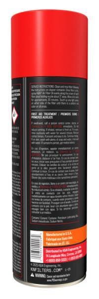 K&N Air Filter Oil is the only oil specially formulated to work in combination with the cotton fabric in K&N air filter elements providing a superior air filtration system. The oil comes in a convenient 6.5 ounce aerosol spray can.; FILTER OIL; 6.5 OZ AEROSOL SPRAY
