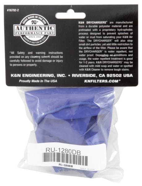 The K&N Drycharger is a silicone treated, polyester wrap that is made to cover K&N Air Filters or Personal Watercraft Flame Arrestors. They contain uniform micron sized openings that allow high air flow.; DRYCHARGER WRAP; RU-1280 BLUE