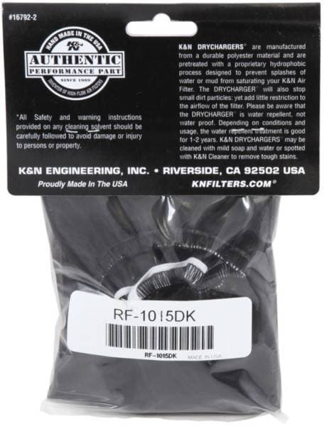 The K&N Drycharger is a silicone treated, polyester wrap that is made to cover K&N Air Filters or Personal Watercraft Flame Arrestors. They contain uniform micron sized openings that allow high air flow.; DRYCHARGER WRAP; RF-1015; BLACK; CUSTOM