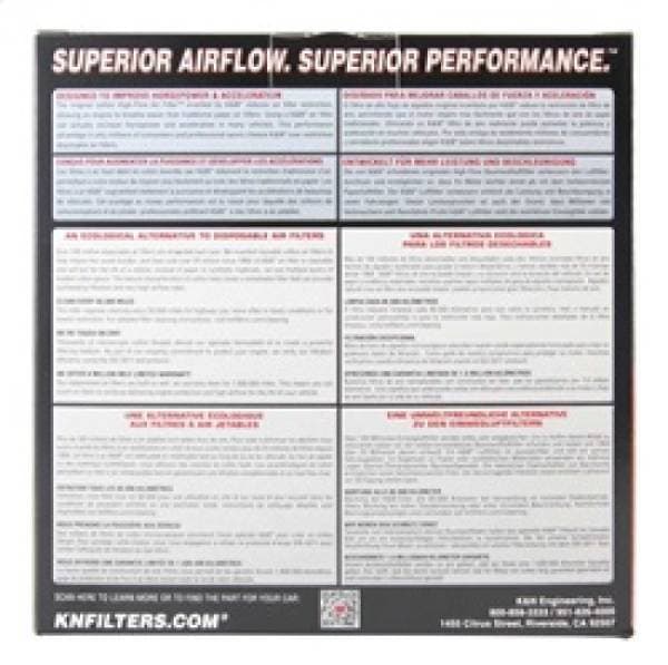 K&N washable, reusable High-Flow Air Filters feature a state-of-the-art design of layered, oiled cotton media engineered to improve airflow and capture contaminants, and are designed to provide an increase in horsepower. Each performance air filter is reusable, engineered to last for the entire lifespan of your vehicle, and backed by K&N's 10-Year/Million Mile Limited Warranty. K&N drop-in replacement filters are designed to install easily into your factory air box. Upgrade today and start enjoying superior airflow and superior performance from K&N's most popular product!