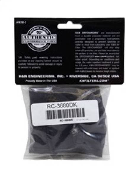 The K&N Drycharger is a silicone treated, polyester wrap that is made to cover K&N Air Filters or Personal Watercraft Flame Arrestors. They contain uniform micron sized openings that allow high air flow.; DRYCHARGER WRAP; RC-3680 BLACK