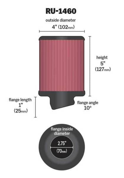 Regardless of the angle or offset diameter of an air intake, there is probably a K&N Universal air filter for your equipment. K&N universal air filters are washable and reusable.; 2-3/4in.10 DEG FLG; 4in.OD; 5in.H