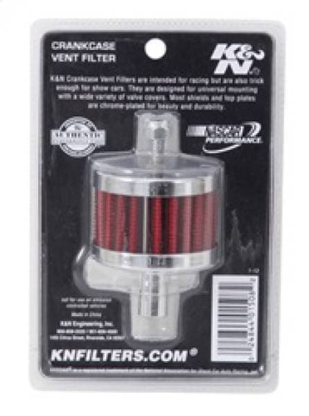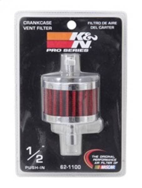 K&N crankcase vent filters are perfect for racing applications, vintage cars or individuals who want to add some aesthetics to their classic carbureted engine. The 62-1110 crankcase vent filter has a chrome-plated steel base and top with a mounting stud. The 1/2 inch diameter zinc tube is designed to push in and clamp directly on to metal or plastic tubing where venting is needed. This air filter constructed with non-woven synthetic filter media it can be cleaned and reused repeatedly.