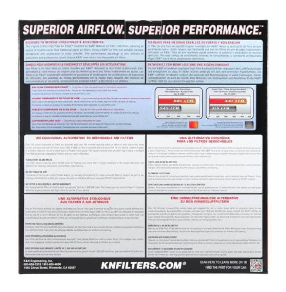K&N washable, reusable High-Flow Air Filters feature a state-of-the-art design of layered, oiled cotton media engineered to improve airflow and capture contaminants, and are designed to provide an increase in horsepower. Each performance air filter is reusable, engineered to last for the entire lifespan of your vehicle, and backed by K&N's 10-Year/Million Mile Limited Warranty. K&N drop-in replacement filters are designed to install easily into your factory air box. Upgrade today and start enjoying superior airflow and superior performance from K&N's most popular product!