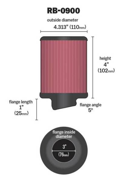 Regardless of the angle or offset diameter of an air intake, there is probably a K&N Universal air filter for your equipment. K&N universal air filters are washable and reusable.; 3in. 5 DEG FLG; 4-5/16in.OD; 4in.H