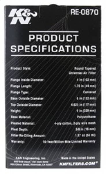 Regardless of the angle or offset diameter of an air intake, there is probably a K&N Universal air filter for your equipment. K&N universal air filters are washable and reusable.; 4in.FLG; 6in.OD-B; 4-5/8in.OD-T; 9in.H