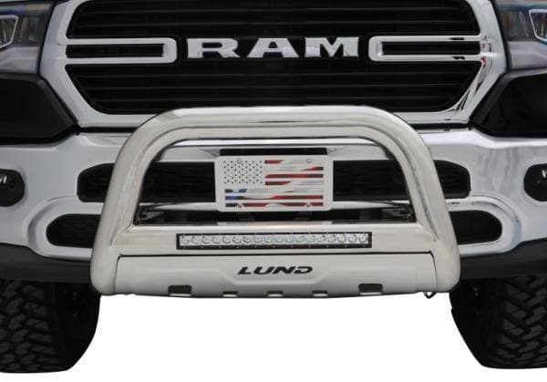 Protects your front end from flying debris with 3.5 inches of oval steel tubing. These bull bars also boost your visibility with an integrated 20 in. LED light bar. The included heavy duty light bar illuminates your night driving with a bright flood beam pattern and is easily wired into your factory light wiring, or a wiring harness can be purchased separately. Available in black textured powder coat or polished T304 stainless steel finish. Our popular LUND bull bars may now be ordered with a wire harness kit. The wire harness kit is also sold separately for lighting and accessories up to 30 Amps. LUND's bull bars with LED light bar and wiring kit is the total package to see and be seen, providing complete front end style, lighting and protection.