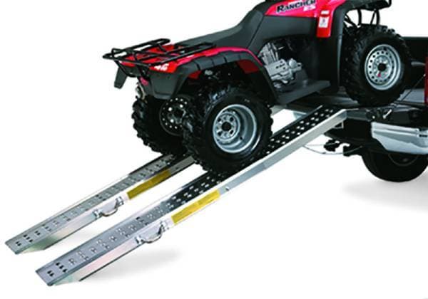 Durable, easy to use extruded Aluminum folding ramps with a lightweight design of 17 lbs. Ramps have swaged holes for increased traction and a rubber angle tailgate protector. Holds up to 1000 lbs. distributed load capacity per section. Sold as one single ramp.
