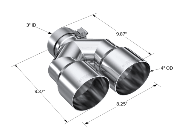 Armor Pro Exhaust Tip; 3 in. Inlet Diameter; 4 in. Outlet Diameter; Right Tip 9.87 in. Length; Left Tip 9.37 in. Length; T304 Stainless Steel; Dual Out; Mirror Polished; 3" ID, Dual 4" OD Out. Staggered Left 9.37"/ Right 9.87" Length. Single Wall. T304 Stainless Steel.