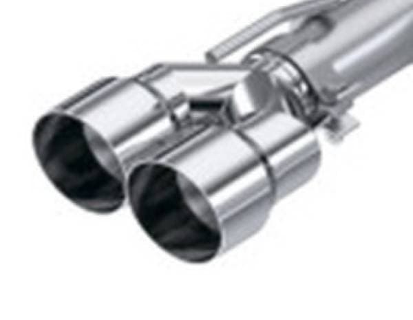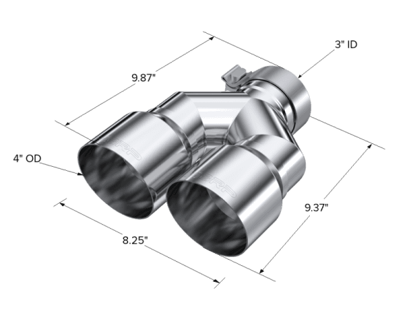 Armor Pro Exhaust Tip; 3 in. Inlet Diameter; 4 in. Outlet Diameter; Left Tip 9.87 in. Length; Right Tip 9.37 in. Length; T304 Stainless Steel; Dual Out; Mirror Polished; 3" ID, Dual 4" OD Out. Staggered Left 9.87"/ Right 9.37" Length. Single Wall. T304 Stainless Steel.
