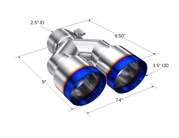 Armor Pro Burnt End Tip; T304 Stainless Steel; 2.5 in. Inlet; Dual 3.5 in. OD. Out; Single Wall; 2.5" ID, Dual 3.5" OD Out. Staggered Left 9"/ Right 9.5" Length. Single Wall. T304 Burnt End.