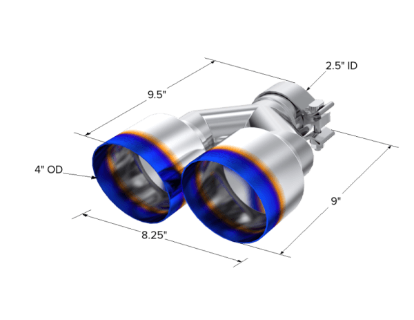 Armor Pro Burnt End Tip; T304 Stainless Steel; 2.5 in. Inlet; Dual 4 in. OD. Out; Single Wall; 9.55 in. Length; 2.5" ID, Dual 4" OD Out. Staggered Left 9.55"/ Right 9.05" Length. Single Wall. T304 Burnt End.