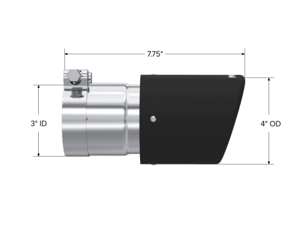 Carbon Fiber Exhaust Tip; 3 in. Inlet Diameter; 4 in. Outlet Diameter; 8 in. Length; Dual Wall; Angled; T304 Stainless Steel; Carbon Fiber Finish; Tip 4in. OD. Dual Wall Angled. 3in. inlet. 7.7in. length. Carbon Fiber.