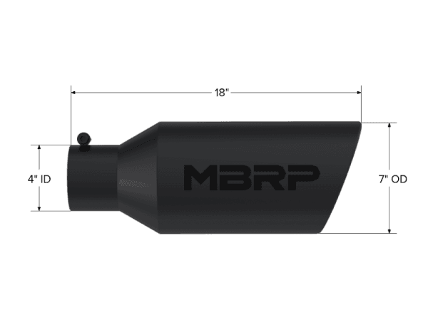 Armor BLK Exhaust Tip; 4 in. Inlet Diameter; 7 in. Outlet Diameter; 18 in. Length; Rolled End; T304 Stainless Steel; Black Coated; Tip. 7in. O.D.. Rolled End. 4in. inlet 18in. in length. Black.