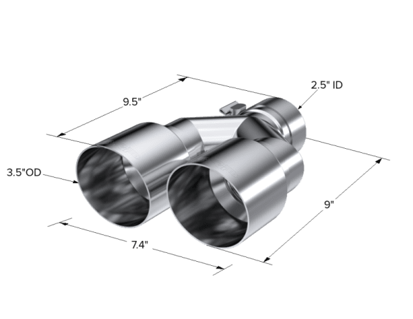 Armor Pro Exhaust Tip; 2.5 in. Inlet Diameter; T304 Stainless Steel; Dual 3.5 in. Outlet Diameter Out Single Wall; 2.5" ID, Dual 3.5" OD Out. Staggered Left 9.5"/ Right 9" Length. Single Wall. T304 Stainless Steel.