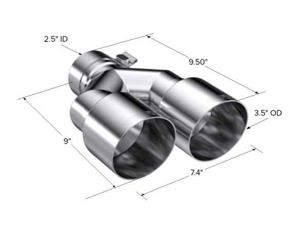 Armor Pro Exhaust Tip; 2.5 in. Inlet Diameter; Dual 3.5 in. Outlet Diameter Out Single Wall; T304 Stainless Steel; 2.5" ID, Dual 3.5" OD Out. Staggered Left 9"/ Right 9.5" Length. Single Wall. T304 Stainless Steel.
