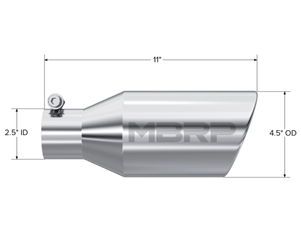 Armor Pro Exhaust Tip; 2.5 in. Inlet Diameter; 4.5 in. Outlet Diameter; 11 in. Length; Single Wall; Angled Rolled End; T304 Stainless Steel; Mirror Polished; Tip. 4 1/2in. O.D.. SW Angle Rolled End. 2 1/2in. inlet 11in. in length. T304 Stainless Steel.