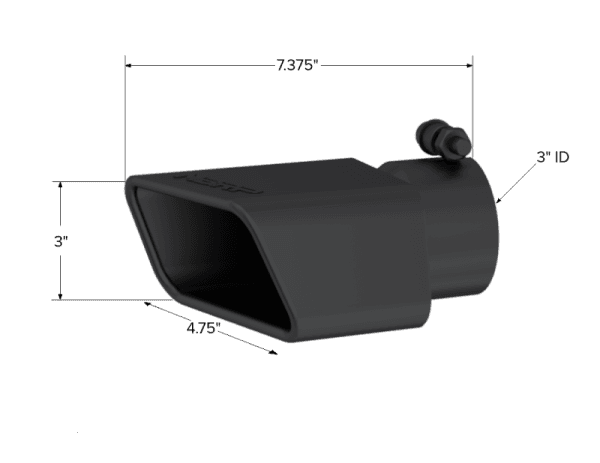 Armor BLK Exhaust Tip; 3 in. Inlet; 4.5 in. x 2.75 in. Outlet; 7.375 in. Length; Rectangle; Angle Cut; Black Coated Stainless Steel; Passenger Side; Tip. 4 in. x 3in.. Rectangle. Angled Cut. 3in. O.D. inlet. Pass. Side. 7 in. length. Black.
