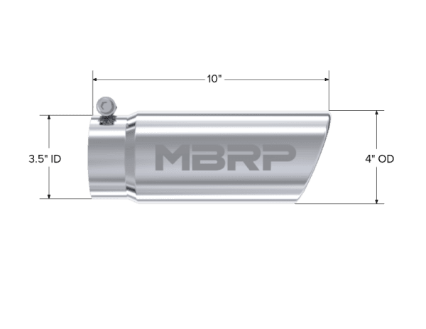 Armor Pro Exhaust Tip; 3.5 in. Inlet Diameter; 4 in. Outlet Diameter; 10 in. Length; Angled Rolled Edge; T304 Stainless Steel; Mirror Polished; Tip. 4in. O.D. Angled Rolled End 3in. inlet 10in. length. T304 Stainless Steel..