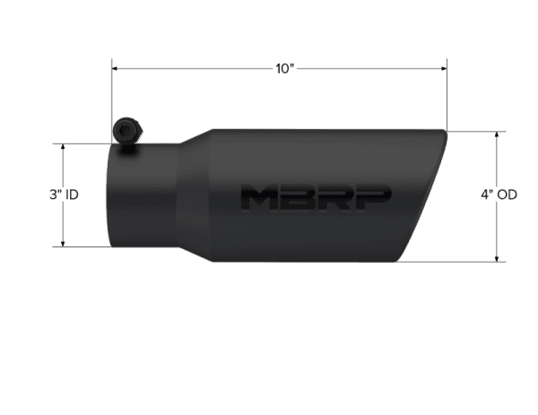 Armor BLK Exhaust Tip; 3 in. Inlet Diameter; 4 in. Outlet Diameter; 10 in. Length; Angled Rolled End; T304 Stainless Steel; Black Coated; Tip. 4in. O.D.. Angled Rolled End. 3in. inlet. 10in. length. Black Coated.