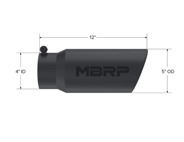 Tip. 5in. O.D. Angled Rolled End 4in. inlet 12in. length-Black Coated.; Armor BLK Exhaust Tip; 4 in. Inlet Diameter; 5 in. Outlet Diameter; 12 in. Length; Angled Rolled Edge; 304 Stainless Steel; Black Coated