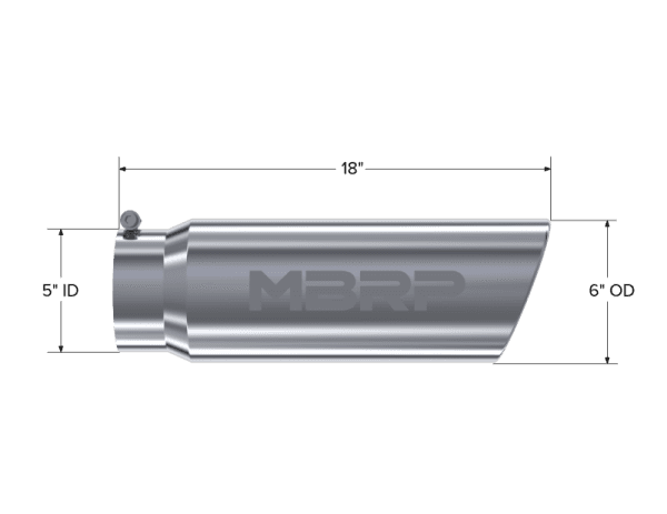 Armor Pro Exhaust Tip; 5 in. Inlet Diameter; 6 in. Outlet Diameter; 18 in. Length; Angled Rolled End; T304 Stainless Steel; Mirror Polished; Tip. 6in. O.D.. Angled Rolled End. 5in. inlet 18in. in length. T304 Stainless Steel.