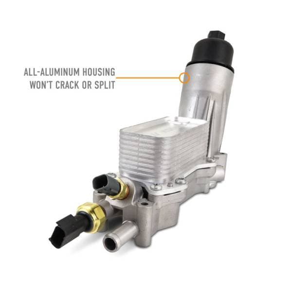 but they're not without their flaws.----The stock 3.6 oil filter housing is made from plastic and is known to become brittle after repeated heat cycles. When that happens, even the slightest amount of torque on the filter cap while performing an oil change can be enough to crack the housing and cause significant oil leaks. To make matters worse, the oil filter housing lives underneath the intake manifold, making it difficult to identify and diagnose the leak. Oil running down the back of the engine can look like a failed rear-main seal and end up costing you thousands in parts and labor, only to have the problem continue. Luckily, Mishimoto offers a solution to prevent the headache of chasing down oil leaks and give you peace of mind.----Our all-aluminum 3.6/3.2L Pentastar oil filter housing kit is a complete safeguard against frustrating oil leaks. As the name suggests, our oil filter housing swaps the stock brittle plastic for a robust aluminum replacement. This housing is significantly stronger than the stock polymer version and won't become brittle over time. We've also upgraded the seals to Viton for improved oil and fuel resistance, ensuring a long service life. This complete kit includes the aluminum housing, oil filter, filter cap, intake manifold gaskets, filter housing seals, heat exchanger, oil temp and pressure sensors, and bolts, making it a one-stop solution for your Pentastar. Like all Mishimoto products, this 3.6L/3.2L Pentastar aluminum oil filter housing kit is backed by our Mishimoto Lifetime Warranty, for a lifetime of leak-free reliability.