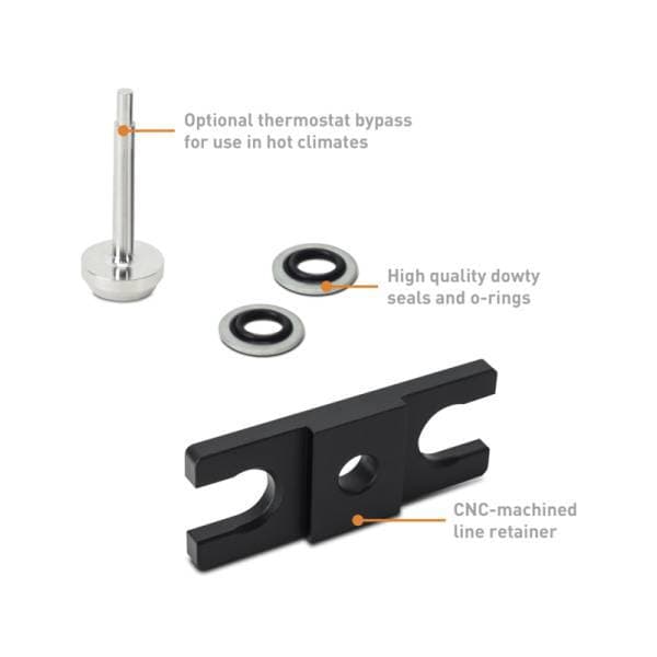 The transmission is the backbone of your RAM. It’s responsible for transmitting large amounts of torque from your 6.7L Cummins powerplant, and that torque generates heat. If that heat isn’t dissipated, it can destroy your transmission. The transmission cooler does a good job of keeping trans fluid temperatures in check, but only if the fluid can reach it. The stock cooling system of both the 68-RFE and Aisin AS69RC utilize an in-line thermal bypass valve that controls the flow of fluid to the transmission cooler. The purpose of this valve is to prevent transmission fluid from flowing to the cooler until it reaches operating temperature. The thermostat inside this valve is prone to failure, however, and when that happens, the fluid never flows to the cooler and the transmission can overheat. That's why Mishimoto has developed an improved thermal bypass valve kit for your 2019+ Dodge Ram 6.7L Cummins. Our CNC-machined aluminum thermal bypass valve not only looks better than the stock unit, but it performs better too. The Mishimoto thermal bypass valve utilizes a replaceable thermostat that is more durable than the stock thermostat and opens about 10 F earlier. This allows fluid to flow to the cooler sooner, without over-cooling. For owners in hot climates, the Mishimoto valve includes a bypass that allows full flow to the transmission cooler, regardless of temperature. The bypass can be easily swapped out with only a wrench for summer or winter driving. The Mishimoto thermal bypass valve flows better in both configurations than the stock valve for more effective cooling. Cooling fins machined into the valve body add even more heat dissipation. This 2019+ Dodge Ram 6.7L Cummins Thermal Bypass Valve Kit is built to last a lifetime with a durable black anodized finish and our Mishimoto Lifetime Guarantee.