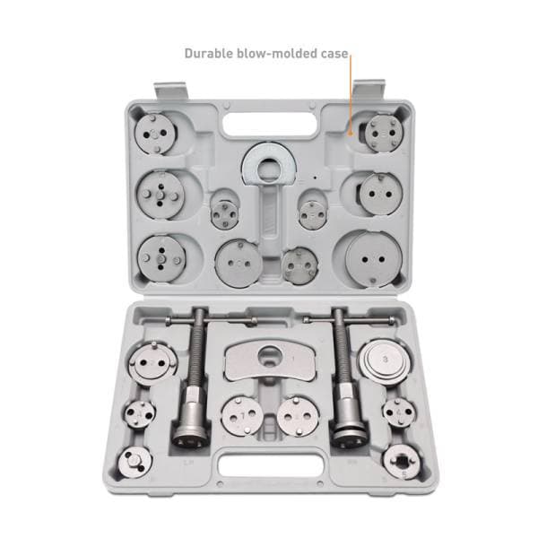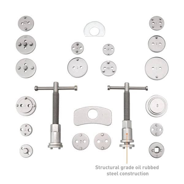 Upgrade your brake maintenance routine with the Mishimoto Brake Caliper Piston Wind Back Tool Kit, the ultimate 22-piece solution for any car enthusiast. Many modern vehicles with emergency brakes integrated into the brake calipers require the piston to be rotated and depressed during a brake service. Crafted from high-quality carbon steel, this kit ensures long-lasting durability and dependable performance. With 18 adapters included, it offers compatibility with hundreds of vehicles, making it an incredibly versatile addition to your toolbox. The kit features both left and right-handed thrust bolt assemblies, accommodating various brake systems with ease. For added convenience, it comes with a durable carrying case for organized storage and protection. Plus, with the Mishimoto Lifetime Warranty, you can trust that this kit will be a reliable companion for all your brake maintenance needs.