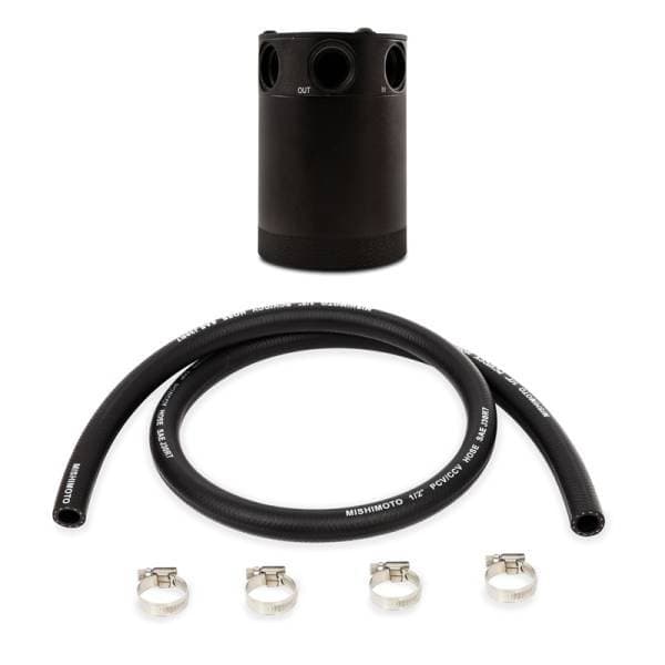 Mishimoto is proud to announce the release of our Compact Baffled Oil Catch Can, available in a two-port or three-port option. With years of oil catch can research and development time, Mishimoto has created the most effective compact oil catch can on the market. The Mishimoto Compact Baffled Oil Catch Can was designed to separate oil particles from the PCV/CCV air that would normally have just been routed back to your intake. The internal air diverter turbulates the air longer and ensures all the oil sinks to the bottom of the can, leaving nothing but clean air to pass through the 50 micron bronze filter to the intake. An internal baffle keeps the collected oil from splashing around under race conditions. This oil catch can features two ports, one inlet and one outlet, for easy installation on CCV and PCV systems. The 100-percent billet, 6061 aluminum can features 3/8in NPT threads at the inlet, outlet, and drain area and includes two black nylon fittings to make installation effortless. For maximum fitment options, the top mounting setup allows the can to be mounted from multiple angles. To make maintenance easy, the drain plug can be removed to allow for a return to the oil pan. The can is also 100-percent washable, unlike many other cans that require you to replace your filtration system.Our catch cans are different from most air-oil-separator (AOS) systems on a few levels. First, our catch cans are not heated. This means that all of the blow-by is able to condense in the can, including low-octane oil vapors and contaminated fuel vapors. Most AOS systems also drain the blow-by back into the oil pan, while our catch cans trap the blow-by and keep it out of the engine permanently. If you've seen what We've seen in the bottom of our catch cans, you won't want that draining back into your oil either.