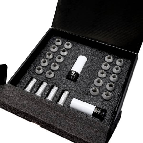 Lock down your wheels with confidence. The Mishimoto Steel Locking Lug Nut 24-piece Kit features a one-piece design that eliminates the common failure points of two-piece lug nuts. Each lug nut is built from high-strength steel to resist swelling, cracking, and impact stress over time. This kit includes 16 standard lug nuts and 4 locking nuts, secured with a 7-point, non-marring locking tool to protect your wheels without damaging the finish. The 19mm hex size fits a wide range of aftermarket wheels, and the open-ended design accommodates extended studs. Available in black or silver, this kit is backed by the Mishimoto Lifetime Warranty to keep your wheels stylish and secure for the long run.