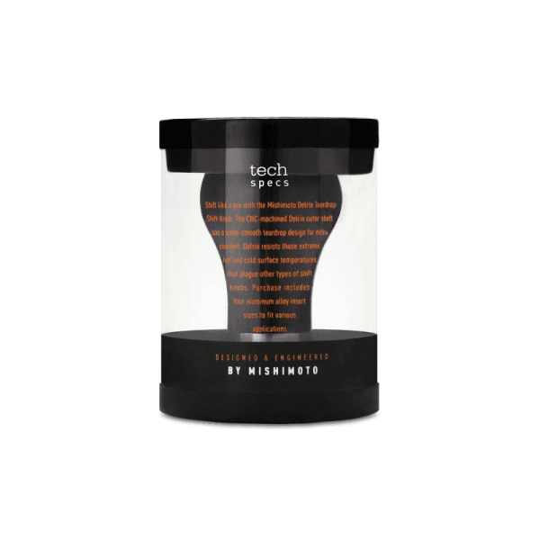 Mishimoto's teardrop shift knob puts a little twist on a classic design. The 2-piece hybrid design incorporates a heavy stainless steel core and a thermoplastic outer shell. The thermoplastic material provides protection against extreme surface temperatures. The thermoplastic shell is available in black or white to help match the style of your interior. This teardrop shift knob weighs in at 294g to provide precise and accurate shifts. This shifter features a plastic insert with three set screws for fitment onto unthreaded shift leavers along with four plastic threaded inserts to allow for fitment on various other vehicles.