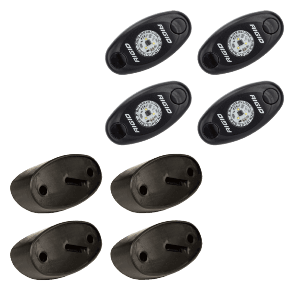 The RIGID Rock Light Kit uses the power and durability of A-Series LED lighting and adds custom 15 foot leads on each light, switch and angled mounts to light up the undercarriage of any truck, Jeep, or all-terrain vehicle. This kit will allow you to light up the trail with strategically placed lights on the vehicle. Perfect for night rock crawling, the LED lights are available in a variety of colors, including white, red, blue, or amber to aid night vision or accent vehicle colors. RIGID Rock Light Kits are available in 4-light or 6-light configurations to enhance and customize your night crawling experience. Own The Night with the original LED Rock Light Kit.