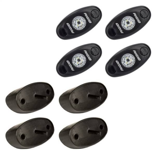 The RIGID Rock Light Kit uses the power and durability of A-Series LED lighting and adds custom 15 foot leads on each light, switch and angled mounts to light up the undercarriage of any truck, Jeep, or all-terrain vehicle. This kit will allow you to light up the trail with strategically placed lights on the vehicle. Perfect for night rock crawling, the LED lights are available in a variety of colors, including white, red, blue, or amber to aid night vision or accent vehicle colors. RIGID Rock Light Kits are available in 4-light or 6-light configurations to enhance and customize your night crawling experience. Own The Night with the original LED Rock Light Kit.