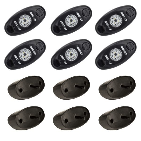 The RIGID Rock Light Kit uses the power and durability of A-Series LED lighting and adds custom 15 foot leads on each light, switch and angled mounts to light up the undercarriage of any truck, Jeep, or all-terrain vehicle. This kit will allow you to light up the trail with strategically placed lights on the vehicle. Perfect for night rock crawling, the LED lights are available in a variety of colors, including white, red, blue, or amber to aid night vision or accent vehicle colors. RIGID Rock Light Kits are available in 4-light or 6-light configurations to enhance and customize your night crawling experience. Own The Night with the original LED Rock Light Kit.