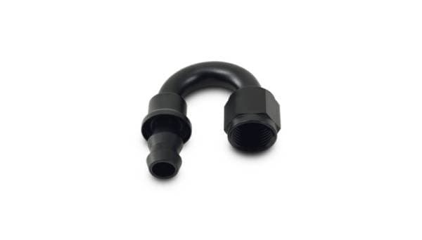Recommended Products: 1st Choice PN: 10259, 2nd Choice PN: 10464, 3rd Choice PN: 11920, 4th Choice PN: 10226, 5th Choice PN: 10234; Push-On 180 Degree Hose End Fitting; -10AN; 6061 Aluminum; Black Anodized