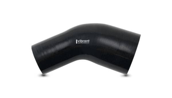 Vibrant Performance Aramid Reinforced Silicone 45 Degrees Transition Elbows feature High Temperature Resistant Aramid Reinforcement Fabric between each layer of silicone which allows for an impressive Operating Temperature Range of -75 Degrees F to 392 Degrees F (-60 Degrees C to 200 Degrees C). These elbows are intended for use in applications where pressurized tubing and connection points require a tight radius bend and size transition to accommodate the installation of piping in limited space. Not suitable for use with Oil/Fuel.