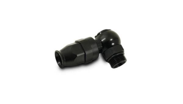 Banjo Hose End Fitting Assembly; -3AN Hose Size; -3AN ORB Bolt Size; 6061 Aluminum; Black Anodized; For PTFE Lined Flex Hose; Straight Cut; Banjo Hose End for PTFE Lined Flex Hose, Hose Size: -3 AN; Bolt Size: -3 ORB (Straight Cut)