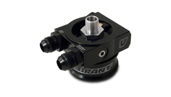 Vibrant's new Oil Cooler Sandwich Adapters bypass hot oil through a cooling loop to help you keep your critical engine oil temperatures under control and allows you to retain your stock oil filter location. Each kit includes a Universal Thermostatic Oil Cooler Sandwich Adapter with Spacer, five (5) Oil Filter adapter bolts (M18 x 1.5, M20 x 1.5, M22 x 1.5, 3/4 in.-16 and 13/16 in.-16), pair of -10 AN inlet / outlet Male Flare adapters and O-Ring seals.