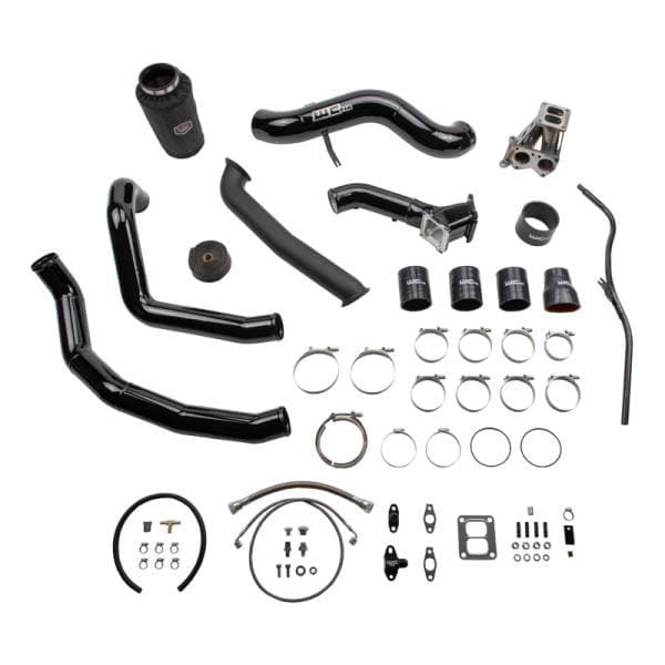 This single fixed vane turbocharger install kit from WCFab for 2001-2004 Chevy Silverado 2500 / 3500 HD trucks contains what you need to swap from your stock IHI style turbo to a larger frame Borg Warner S300 style setup on a 6.6L LB7 Duramax diesel engine. Upgrades your existing air cleaner setup to a 4" fabricated aluminum intake with heavy duty sheet metal air box and high performance dry filter with pre-filter cover. Intercooler hot and cold side charge pipe plumbing are also updated to high flow 3" diameter mandrel bent 14 gauge aluminum tubes. Includes our upgraded high flow 3" fabricated billet y-bridge kit which replaces the restrictive stock upper intake manifold to finish off the air flow path into the engine and allow for maximum horsepower and efficiency gains. Supplied Oil Lines are high-quality stainless steel braided Parker Lines with the oil feed line routing from the main oil galley on the side of the engine block. A variety of popular turbo size options (sold separately) mount to a T4 fabricated steel pedestal with spacer which is compatible with our 2" high flow stainless steel up pipes. Included high temp ceramic coated turbo downpipe connects to your existing exhaust front pipe V-Band clamp. This simplifies installation and requires NO cutting or modification to your exhaust system. If you are not purchasing a genuine Borg Warner turbo from us, you must specify the brand and details of what you are using so that our sales team can assist you with placing your order and ensure proper fitment. You may be required to ship a separately supplied turbo to us in advance for mock-up to build your kit. Your order lead time starts when we have the turbo needed to build your kit our possession. Includes Driver Side Transmission Dipstick Tube, making installing the down pipe easier.
