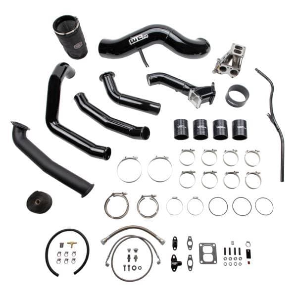 This big single turbocharger install kit from WCFab for 2001-2004 Chevy Silverado 2500 / 3500 HD trucks contains what you need to swap from your stock IHI style turbo to a larger frame Borg Warner S400 style setup on a 6.6L LB7 Duramax diesel engine. Upgrades your existing air cleaner setup to a larger 5" fabricated aluminum intake with heavy duty sheet metal air box and high performance dry filter with pre-filter cover. Intercooler hot and cold side charge pipe plumbing are also updated to high flow 3" diameter mandrel bent 14 gauge aluminum tubes. Includes our upgraded high flow 3" fabricated billet y-bridge kit which replaces the restrictive stock upper intake manifold to finish off the air flow path into the engine and allow for maximum horsepower and efficiency gains. Supplied Oil Lines are high-quality stainless steel braided Parker Lines with the oil feed line routing from the main oil galley on the side of the engine block. A variety of popular turbo size options (sold separately) mount to a T4 fabricated steel pedestal with spacer which is compatible with our 2" high flow stainless steel up pipes. Included high temp ceramic coated turbo downpipe connects to your existing exhaust front pipe V-Band clamp. This simplifies installation and requires NO cutting or modification to your exhaust system. If you are not purchasing a genuine Borg Warner turbo from us, you must specify the brand and details of what you are using so that our sales team can assist you with placing your order and ensure proper fitment. You may be required to ship a separately supplied turbo to us in advance for mock-up to build your kit. Your order lead time starts when we have the turbo needed to build your kit our possession. Includes Driver Side Transmission Dipstick Tube, making installing the down pipe easier.