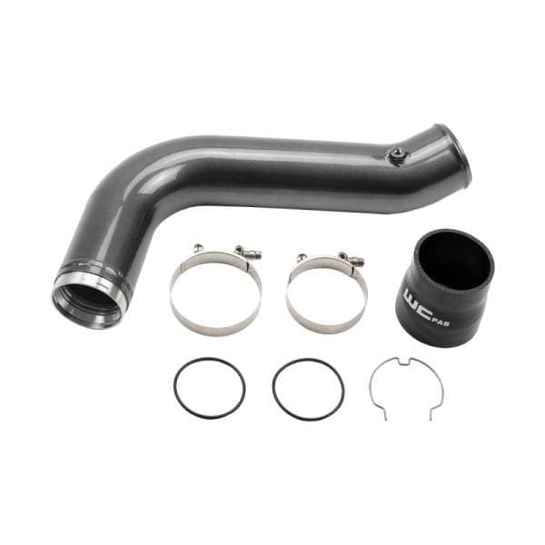 The WCFab 3.5" High Flow Passenger (Cold) Side Intercooler Pipe for 2017-2019 L5P 6.6L Duramax equipped Chevrolet Silverado or GMC Sierra 2500 / 3500 HD truck replaces the factory plastic two piece pipe with a high flow, 14 ga. aluminum one piece 3.5" pipe. - - This part uses a CNC machined flange with a double o-ring seal and an upgraded silicone boot in order to withstand higher boost pressures than the factory components to increase reliability and eliminate blown factory boots and horsepower-robbing boost leaks. This pipe is compatible with stock trucks requiring no additional modifications, upgrades, or tuning for installation. - - Replaces the following GM Part Numbers: 84189332