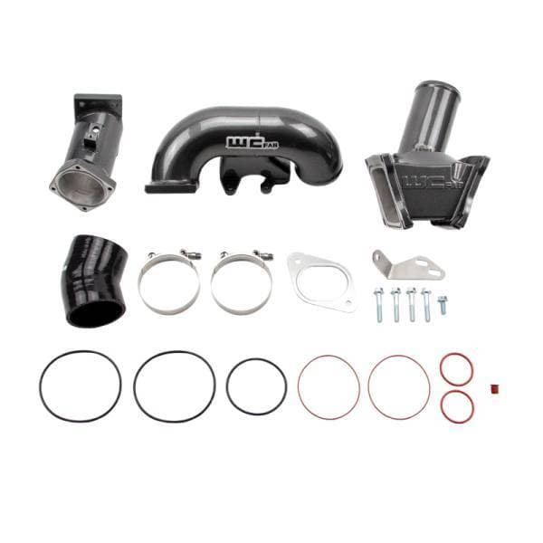 This LMM 3" Y-Bridge Kit is an upgraded high flow intake kit for the 2007.5-2010 LMM Duramax which replaces the OEM upper intake manifold supplying air to the engine intake runners. The OEM Y-bridge for these trucks is a poorly designed, slip-fit style two piece bridge with very little support and is prone to blowing apart under boost on hard working and high performance trucks creating poor drivability and decreased power. This kit is a much improved, high flow, bolt together style two piece 3" bridge which provides a secure sealing surface where the air inlet horn connects to the bridge. 3" high flow upper and lower intercooler pipes feature smooth flowing mandrel bends, CNC machined billet flanges and perfectly compliment the y-bridge to offer a full 3" tract from intercooler pipe slip connection to the engine incorporating the factory grid heater, throttle valve, and EGR connection controls. Compatible with OEM lower passenger side intercooler pipe as well as our upgraded 3.5" High Flow Passenger Side Intercooler Pipe Kit WCF100367. Finished in your choice of custom powder colors. This product is compatible with stock trucks requiring no additional modifications, upgrades, or tuning for installation. Pairs best with emissions compliant tuning and drop in turbochargers for optimum performance gains.