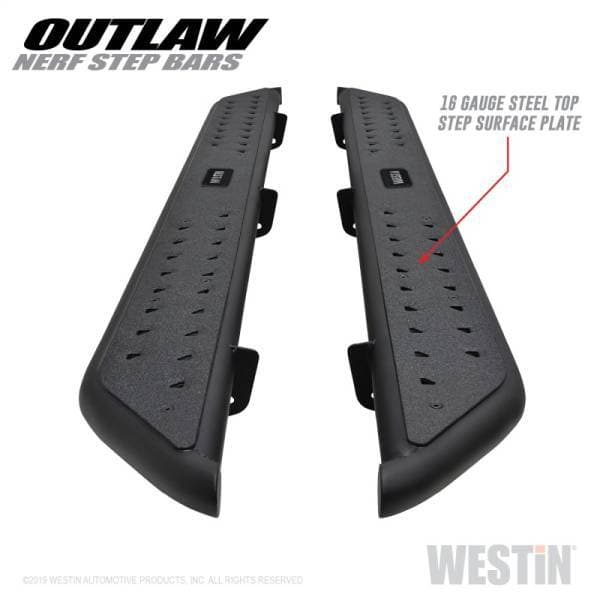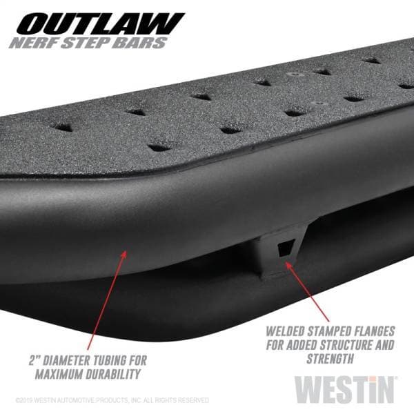 Westins Outlaw Nerf Step Bars offer the perfect balance between function and strength resulting in the ultimate rugged look designed to last and impress. Engineered to fit tightly against rocker panels, the Outlaw Nerf Step Bars provide a solid fit and superb protection while simultaneously improving vehicle cab access. Whether you are an avid overlander or simply an off-roader, rest assured you will be safely stepping into your vehicle with a 16 gauge steel coarse step surface and 2" diameter tubing. Featuring bolt-on installation, an e-coated base coat and textured black powder coat top finish, Westins Outlaw Nerf Step Bars are the ideal match for the toughest of conditions.